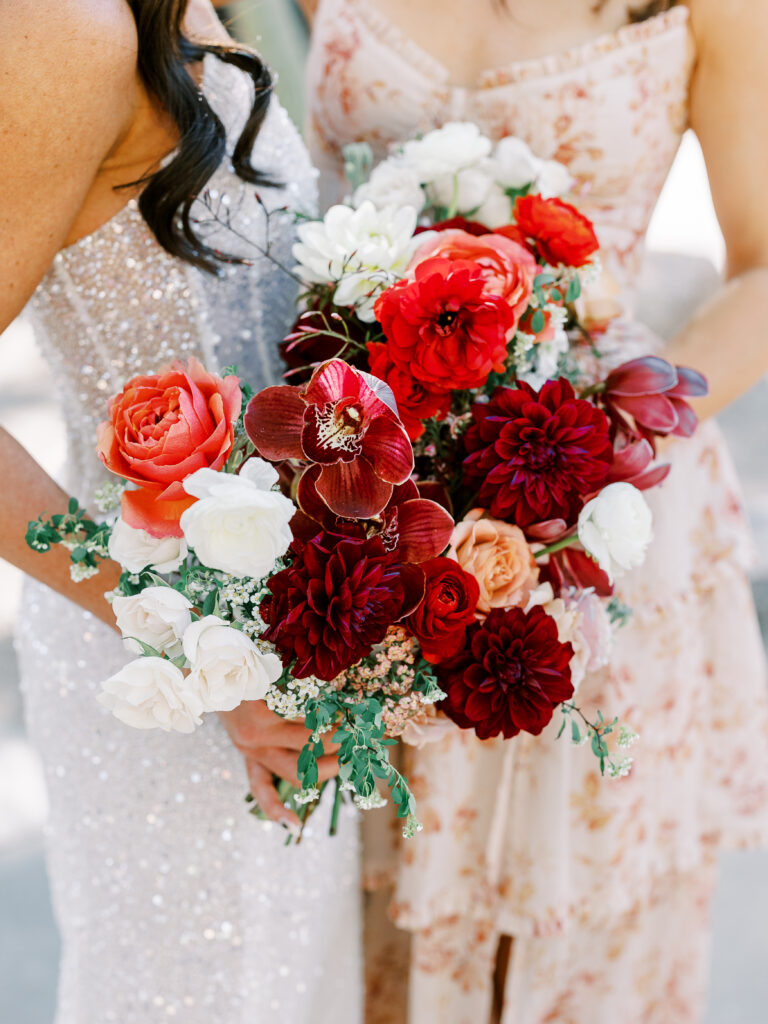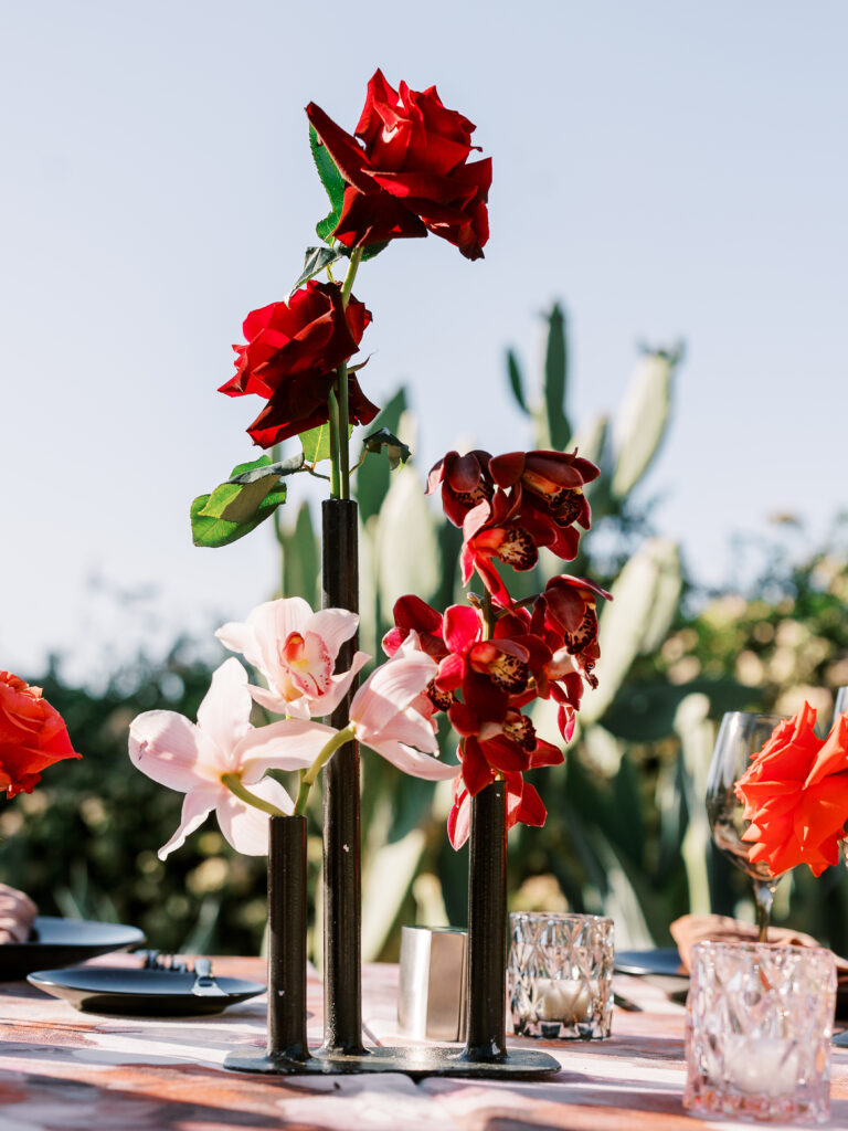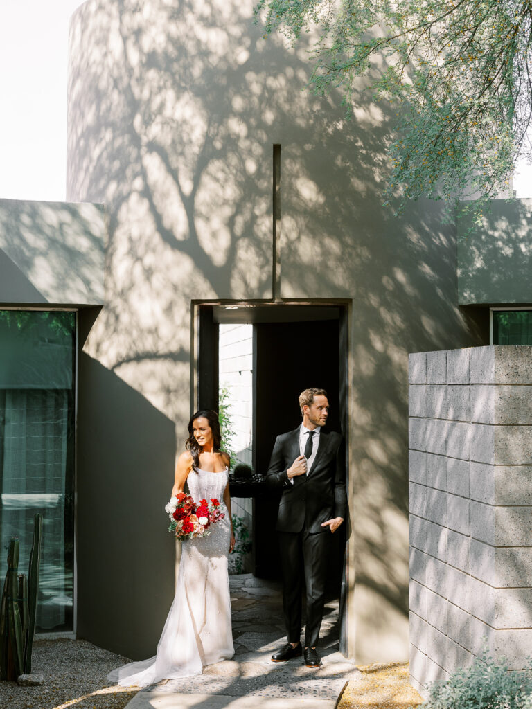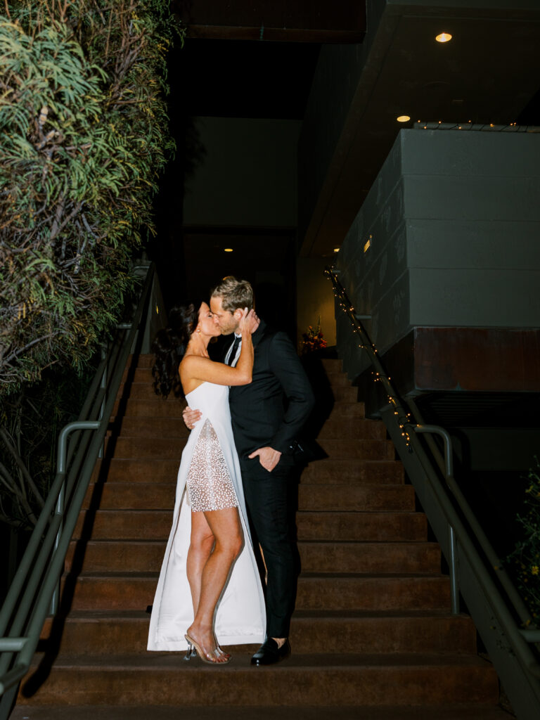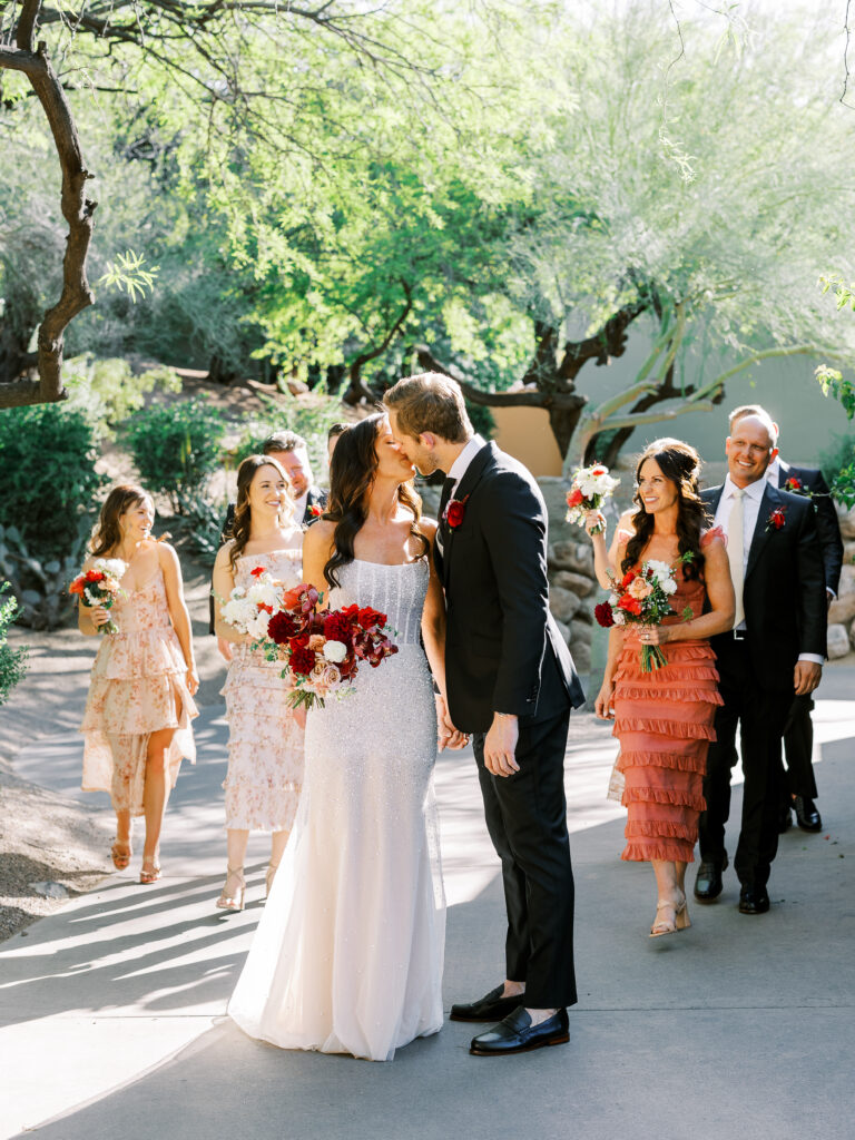 The couple exchanged vows surrounded by desert blooms, with Camelback Mountain glowing golden in the background. As the sun set, guests were treated to a dinner under the stars, complete with a curated martini bar and bespoke cocktails that reflected the couple’s vibrant personalities.